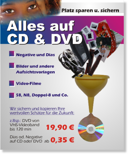 Wussten Sie, dass sich bei Videokassetten die Magnetschicht auflöst, Videokassetten erheblich an Qualität durch Erdmagnetismus und Luftfeuchtigkeit verlieren und Bandsalat im Videorekorder eine häufige Ursache für Totalverlust ist? Wir retten Ihre Videokassetten und sichern Ihre schönsten Erinnerungen schnell und einfach! Wir überspielen Ihre VHS, VHS-C, S-VHS, S-VHS-C, 8mm, Hi8 , Beta, DV, CD, DVD und andere Formate mit modernster Technik und brennen anschließend Ihre Videoaufnahmen auf DVD. Lassen Sie alte Zeiten als unvergessliches TV-Erlebnis lebendig werden!