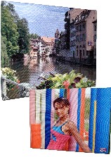 Speziell entwickeltes Canvas-Gewebe für Transferdruckverfahren und lösemittelfreie Sublimationstinte garantieren beste Farbverbindungen auf molekularer Ebene mit der Textilfaser. Dieses Verfahren unterscheidet sich im wesentlichen vom üblichen Tintendruck auf beschichtetem Canvas. Sie erhalten somit eine brillanter Optik, fotorealistisch, konturenscharf, lichtecht, reflexionsfrei, UV-beständig und sogar kratzfest. Formate ab 20x30 cm werden sorgfältig auf Keilrahmen gespannt können aber auch nur lasergeschnitten geliefert werden.