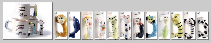Für das tierische Trinkvergnügen gibt's bei uns Tassen mit 11 verschiedenen Tiermotiven: Affe - Delphin - Drache - Hase - Katze - Kuh - Maus - Schaaf - Schildkröte - Tiger - Zebra - Dalmatiner. Die Tassen haben eine Höhe von 103mm, einen Durchmesser von ca. 83mm und sind ca. 290g schwer.
