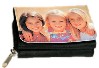 Textil-Geldbörse, schwarz mit Druck-knopfverschluss, Münzfach, 4 Karten- fächern u. Schein- fach. Druckfläche ca. 11,7 x 7,5cm