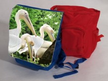 Mit bedruckbarer Frontlasche - unverwechselbar. Verstellbare Schultergurte, Reißverschlüsse, Seitentaschen und kleiner Fronttasche. Erhältlich in blau oder rot. Größe ca. 26x20x14cm